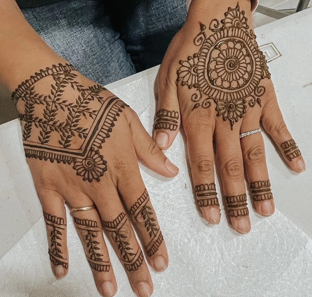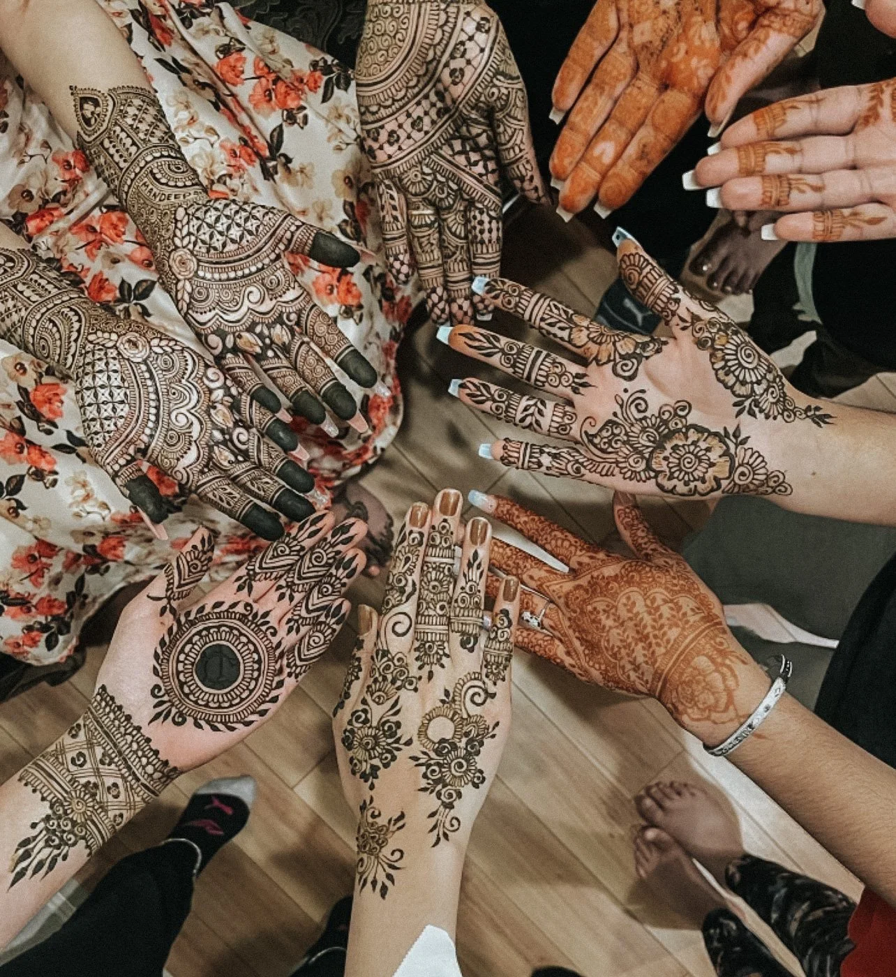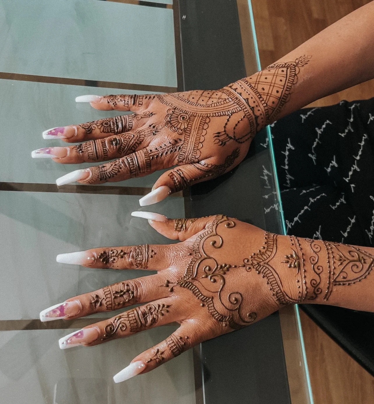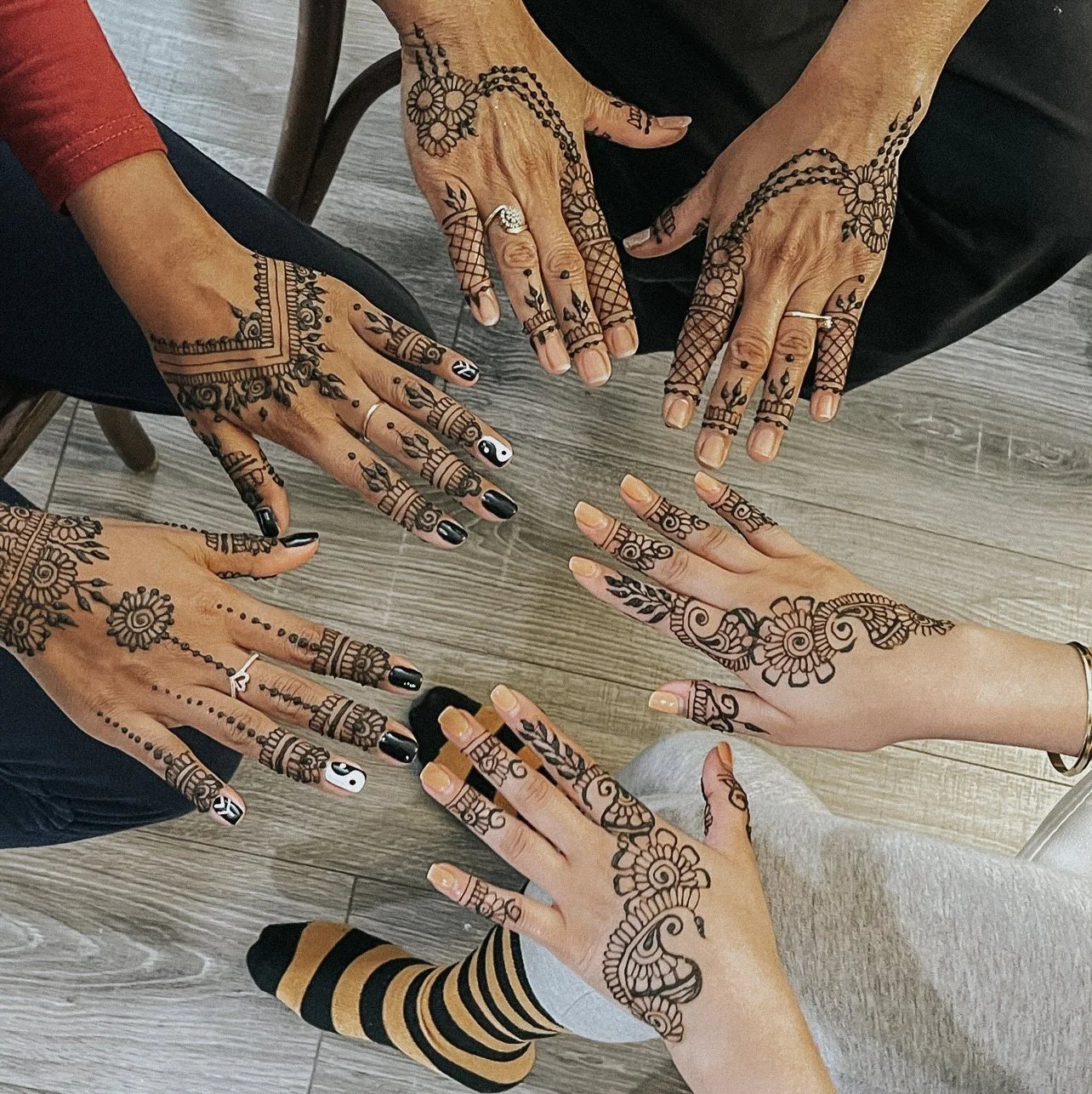 With 3+ years of experience, Kush has developed an incredible speed of doing mehndi. She only spends 4-5 minutes to create a simple design that looks like this; that's 12-15 one-sided hands per hour! We understand that your bridesmaids may get larger designs. Full hands take longer to do because of the intricacies involved and can be 10-25 minutes per design. We recommend saving full designs for immediate family members only or hiring the appropriate number of artists per the amount of guests needing mehndi.